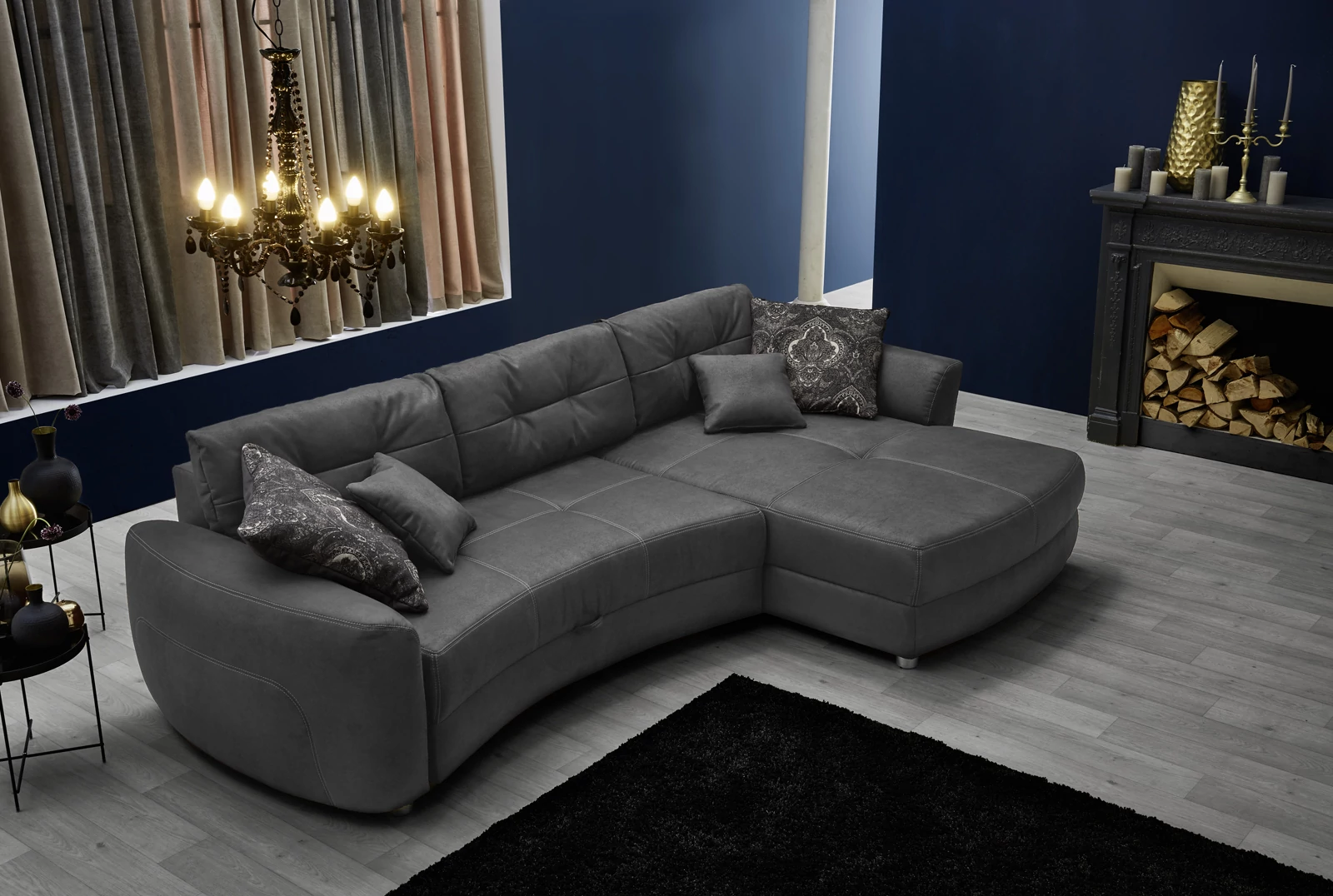 Egy nem mindennapi formavilágú ülőgarnitúra vendégágy funkcióval. Jó minőségű poliuretán habbal és Nosag rugóval megerősített ülő- és fekvőfelület. Az ülőfelület alatt megfelelő méretű ágyneműtartó gondoskodik a tárolásról. A megrendelés 3 hátpárnát és 2 díszpárnát tartalmaz. A garnítúra hátfala saját szövetével bevont, így térben is elhelyezhető.