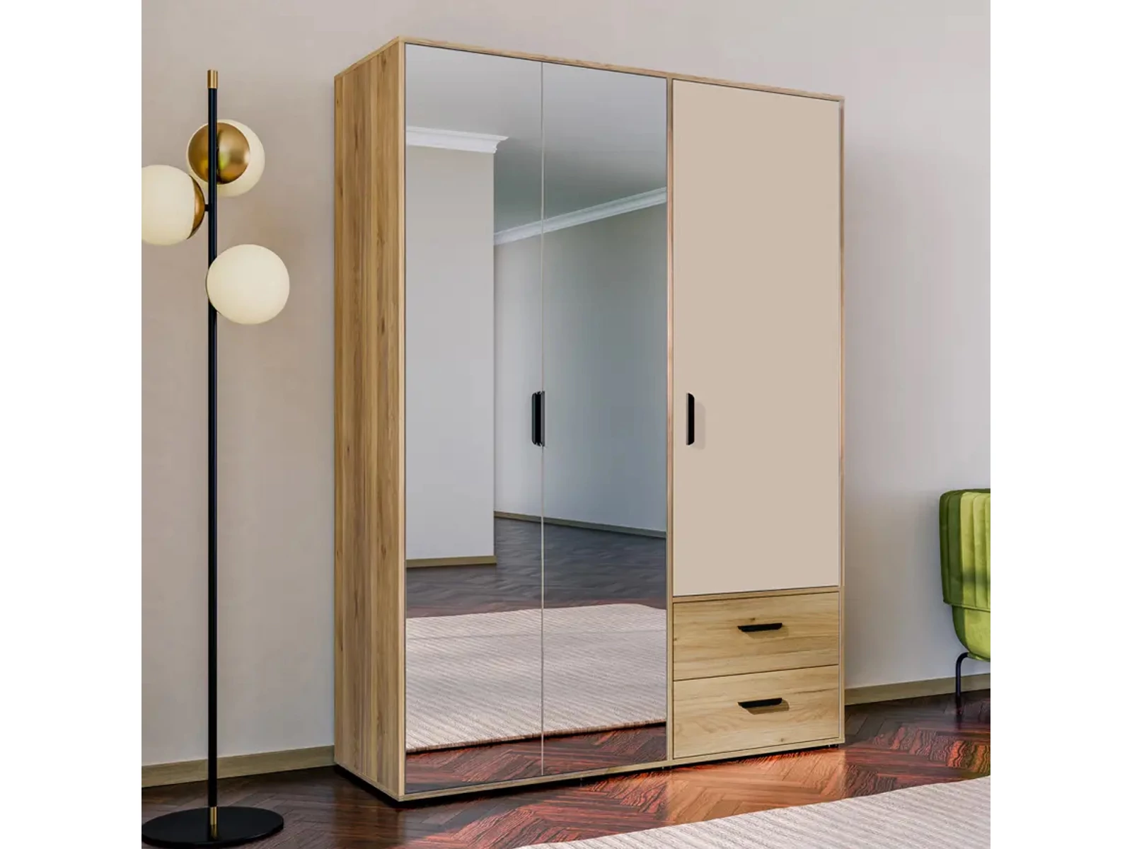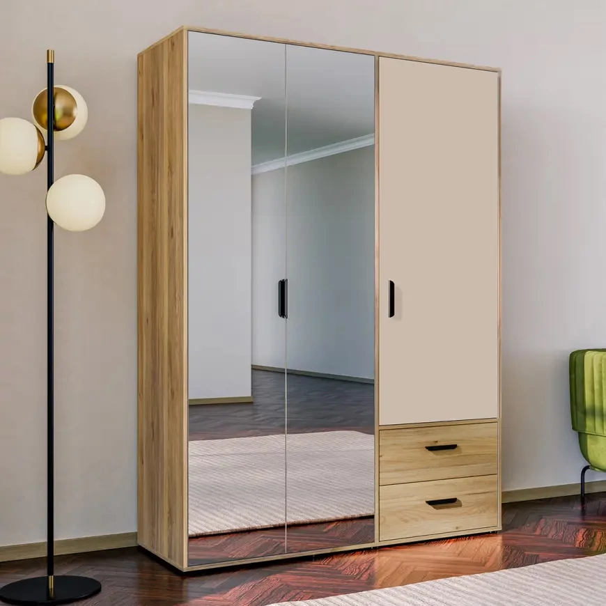 A Mokkaro gardróbszekrény a modern homoktölgy és bézs színeket ötvözi praktikus tükrös ajtókkal. Tágas belső tere akasztós és polcos részeket, valamint könnyen hozzáférhető fiókokat kínál a ruhák tökéletes rendszerezéséhez.