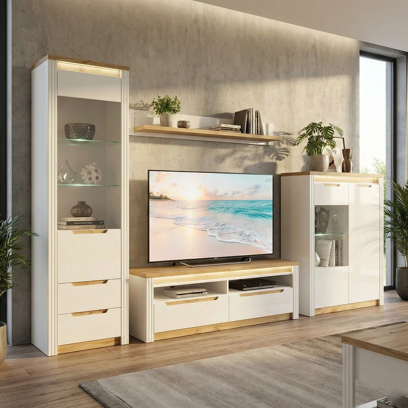 Beépített hangulatvilágítás: Az üvegpolcos vitrinek integrált LED világítással rendelkeznek, amely kiemeli kedvenc dísztárgyait és különleges esti fényt kölcsönöz a szobának.